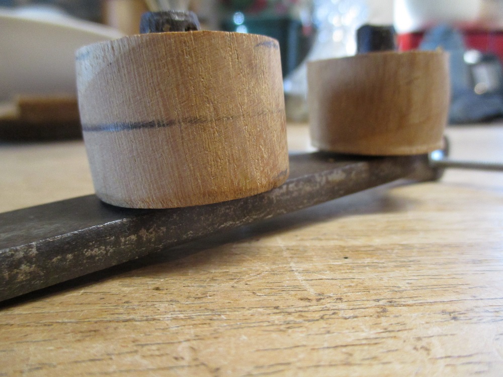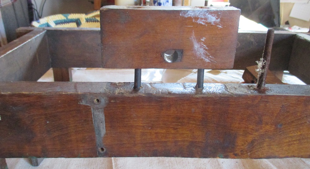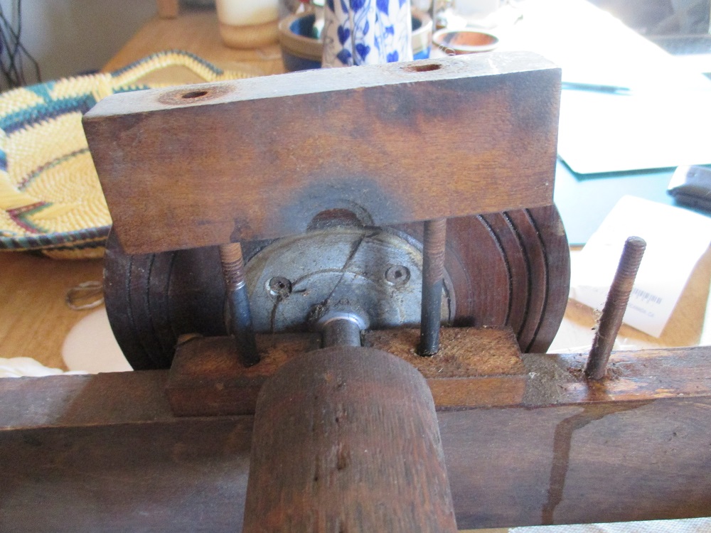 Fortunately, I have another drum carder which I have been able to use as a model, without which I would not have known that I needed two wooden bearings on the tension rod for the belt to drive the rollers. With the aid of a drill press and a piece of 1.5-inch dowel, these were produced and a leather drive belt was made.