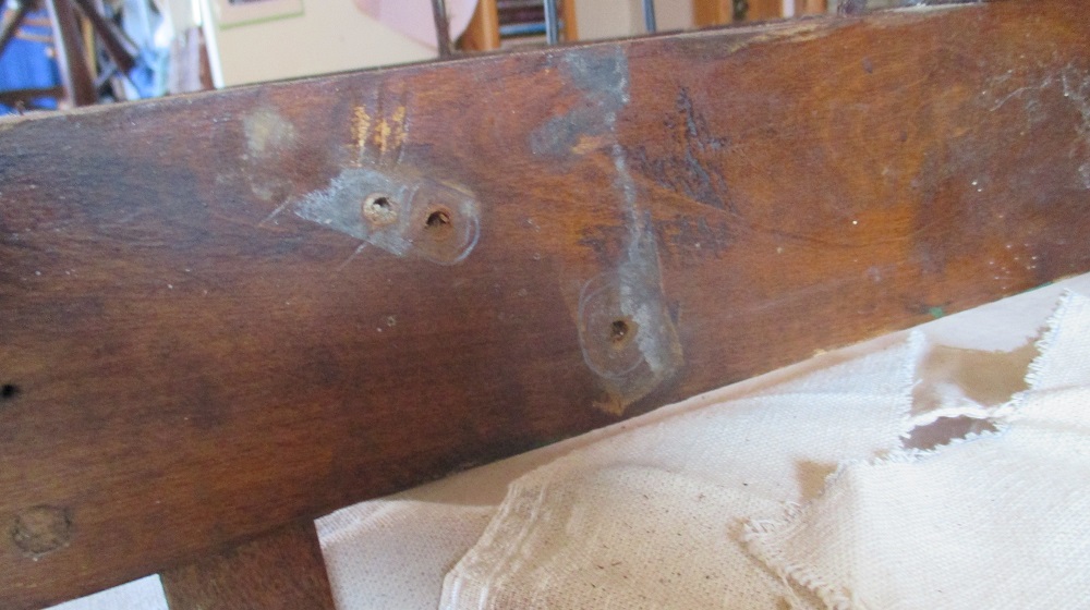 Fortunately for me, I was able to pick this old, rusted, drum carder body for less than $100. Howard Brush company supplied the new carder cloth. Now it is up to me to clean her up and rebuild her. The story is in the photos, but here is a brief description of the job so far. The nuts all threaded off with only a little bit of muscle, despite the rust. The cotter pin (and bent nail) pulled out easily to allow me to remove the Drum sled (for want of a better name). Removing the screws that held the braces on each side revealed a hidden hole, so, for ease of rebuilding, I circled the one the screws came out of. The nuts and washers on the feed roller assembly were removed and the blocks were carefully pried off. Now the frame is wide open and the cleaning can begin.