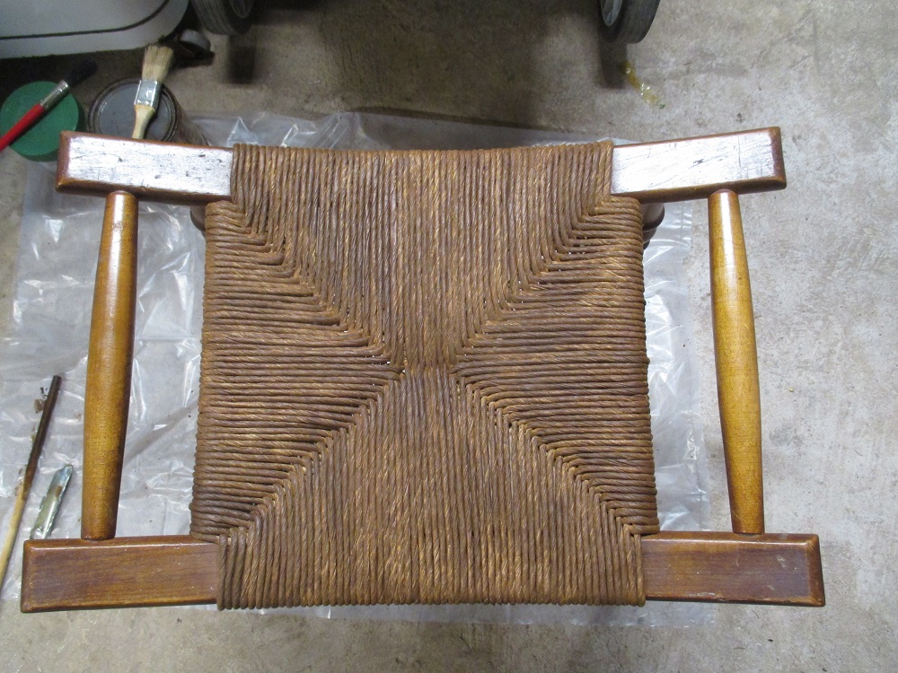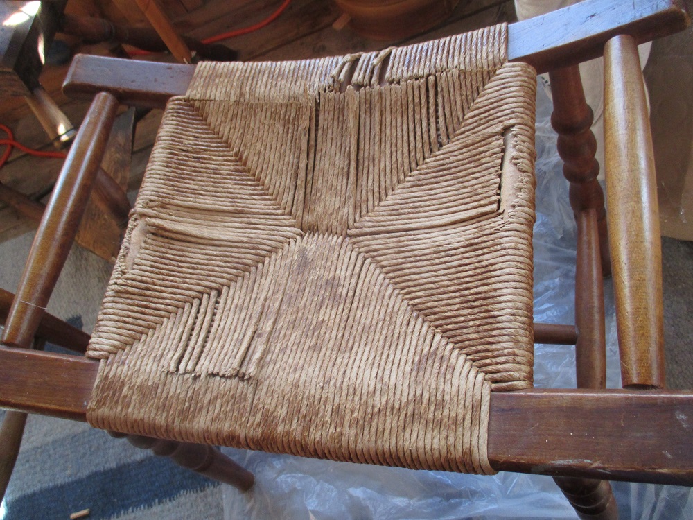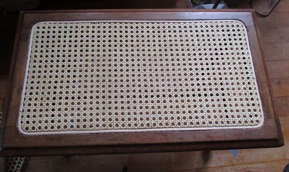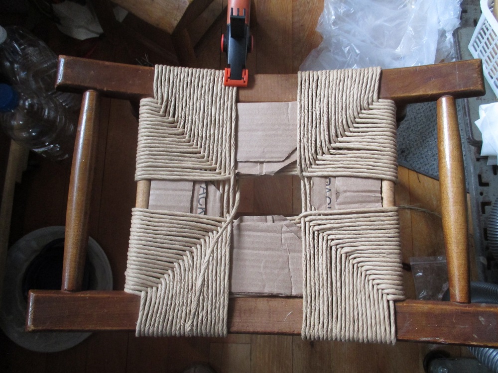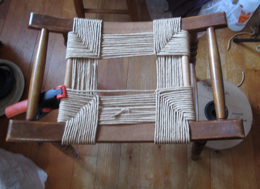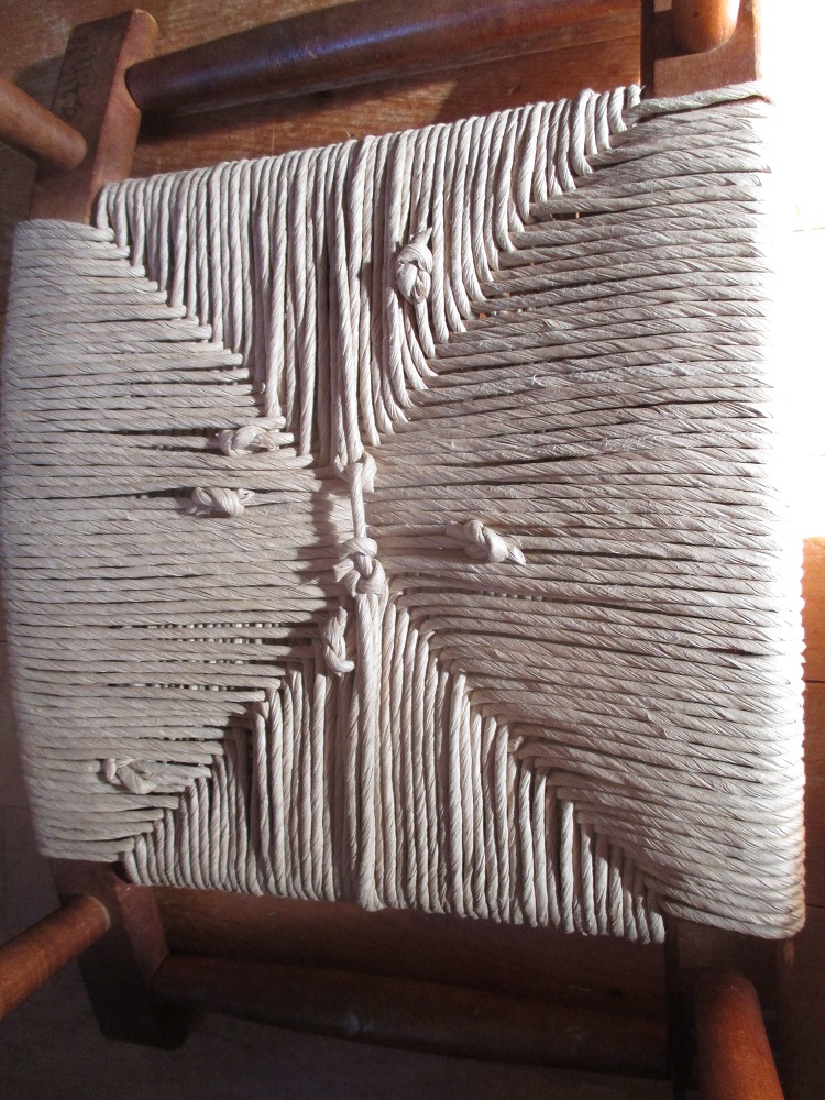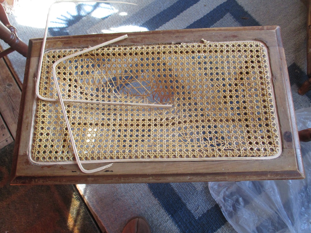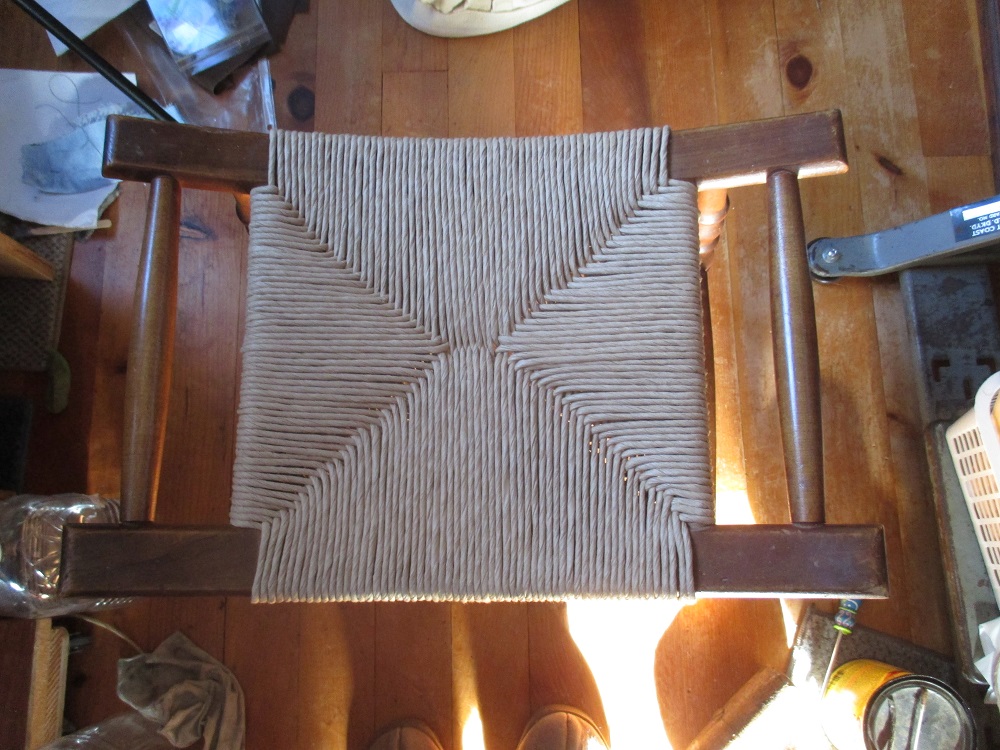 Pairs of vertical and horizontal canes are woven first. Pegs hold the tension on the damp cane. Then the diagonals give the distinctive “caned seat” pattern. It’s a time-consuming, intricate job but I love it.